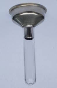 Flacher Pulvertrichter aus Edelstahl genau passend für unsere 50 und 75 Grain Pulverröhrchen.37mm breit, 27mm hoch, Trichtermund 9,5mm aussen und 8,25mm innen