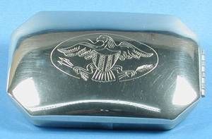 Hergestellt für die Aufbewahrung von Feuerstahl, Feuerstein und Zunder. Größe ca. 9,5 x 6 cm , Höhe 20mm, Material Neusilber mit Adlergravur