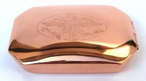 Hergestellt für die Aufbewahrung von Feuerstahl, Feuerstein und Zunder. Größe ca. 9,5 x 6 cm , Höhe 20mmMaterial Kupfer mit Adlergravur,