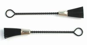 2 Kunststoffbürsten mit Handhabe aus gedrehtem Stahldraht. Gesamtlänge 75mm.Bei Steinschlosswaffen bildet sich nach dem Abbrand des Zündpulvers in der Pfanne eine Schicht aus stark hygroskopischem Pulverschmauch, der nach jeder Zündung weg gebürstet werden soll. Ansonsten "zieht" der Pulverschmauch so viel Feuchtigkeit aus der Luft, dass der Schmauch die nächste Schicht Zündkraut beeinträchtig und die Züngeschwindigkeit verlangsamt.
