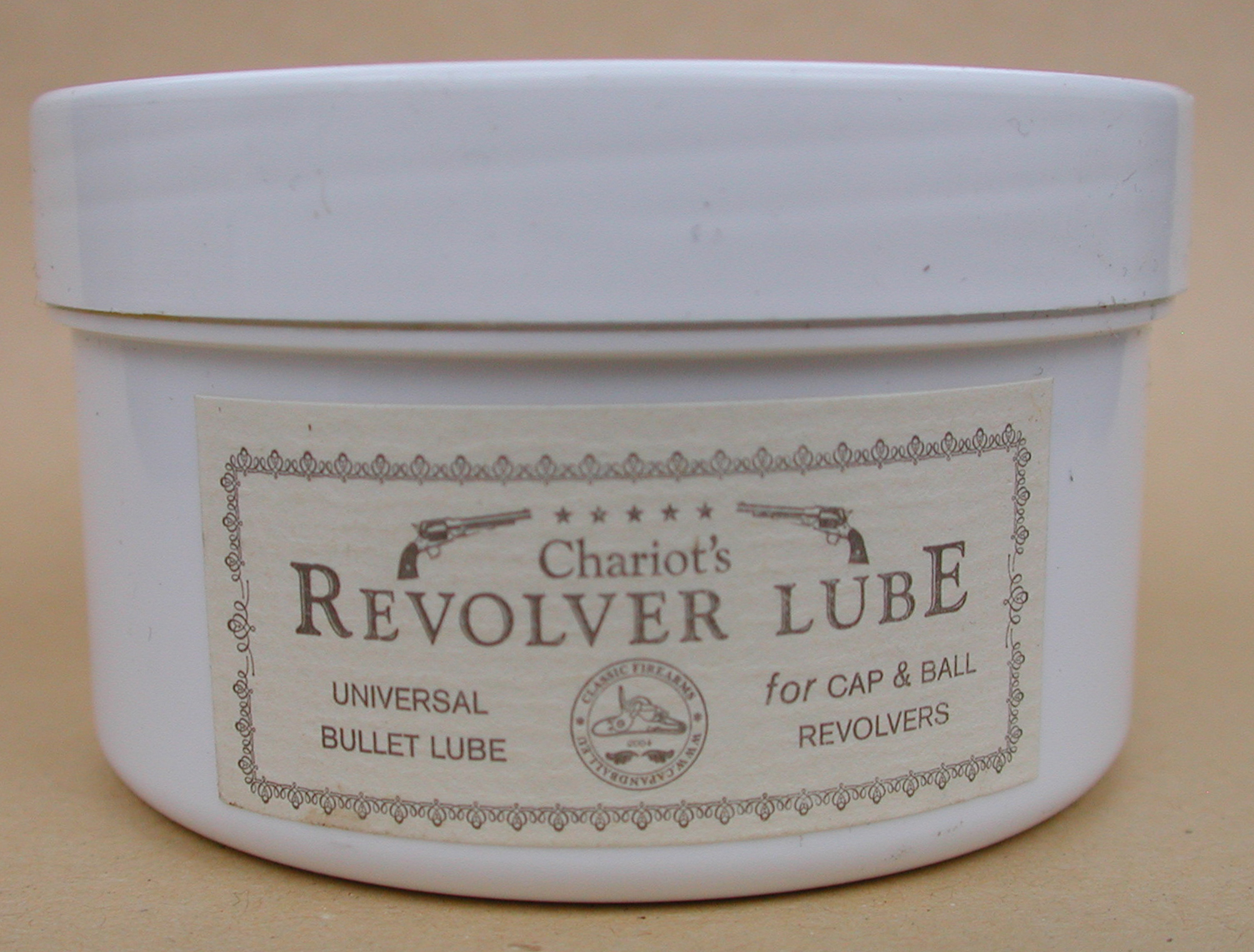 Chariot Revolver Lube für Vorderladerrevolver. Beim Laden der Kugel sollte diese mit dem höchsten Punkt ca. 2mm unterhalb des Trommelrandes sitzen. Die verbleibende Resthöhe wird mit Fett aufgefüllt. Dieses vermindert die Reibung zwischen Kugel und Lauf und hält gleichzeitig die Schwarzpulverrückstände weich. Inhalt ca. 150g