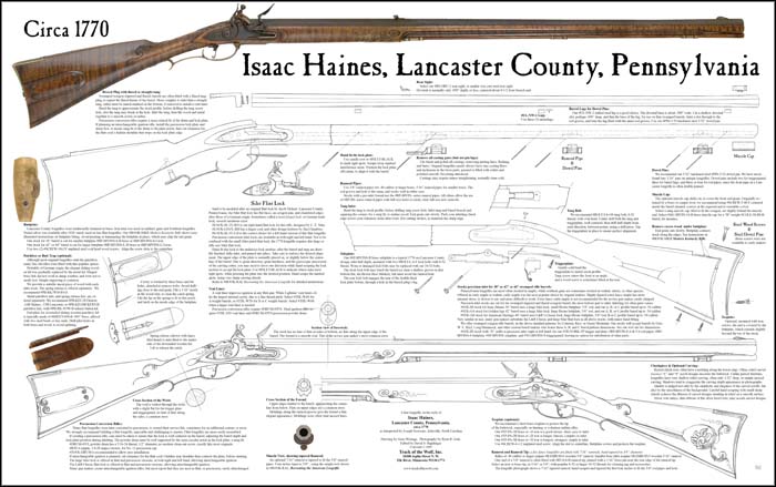 1 : 1 Bauplan einer Isaac Haines Rifle aus dem Lancaster County, Pennsylvania aus der Zeit um 1770. Aus dem Buch Artistic Ingredients of the Longrifle von Dr. George Shumway geht hervor, dass Isaac Haines einer der stilprägenden Büchsenmacher im Lancaster County war. Der zeitgenössische amerikanische Büchsenmacher John Bivins machte diese Lancaster County Rifle berühmt, als er diese als 1776 Commemorative Rifle für den Commonwealth of Pennsylvania baute. Format ca. 90 x 150 cm
