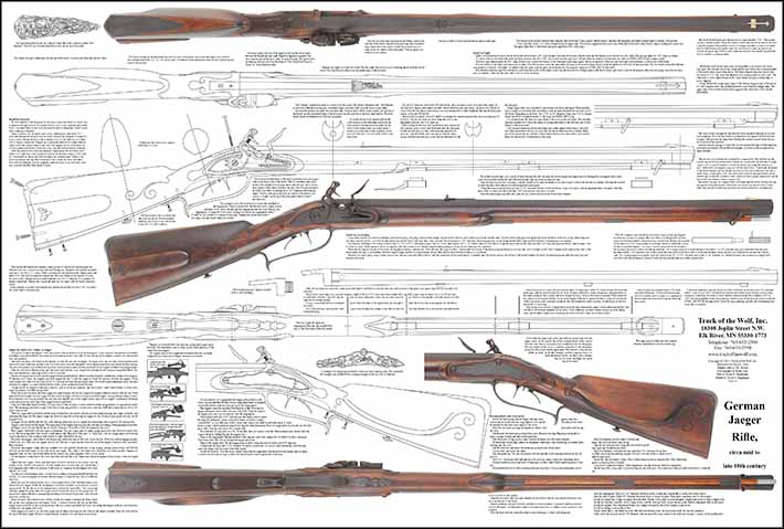 Bauplan für eine deutsche Jägerbüchse im 1 : 1 Format. Abgebildet iast der Bauplan für ein Gewehr mit 31" (76cm) langem Lauf. Der Plan kann auch verwendet werden für eine deutsche Jägerbüchse mit 37" (91cm) Lauf.
