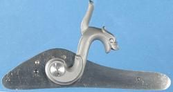 Perkussionsschloss von L&R für deutsche Scheibenbüchsen. Hahn schön verziert mit Tierkopfmotiv. Größe 126x30mm