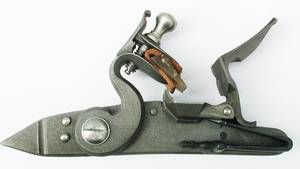 Chambers DELUXE Siler Steinschloss rechts, für Gewehre. Die Basis bildet die Standard Schloßplatte vom großen Siler mit von innen verschraubter und verzierter Batteriefeder, größerer Hahn und veränderter Nuß für eine noch bessere Funktion. 134,5mm lang, 23,6mm hoch